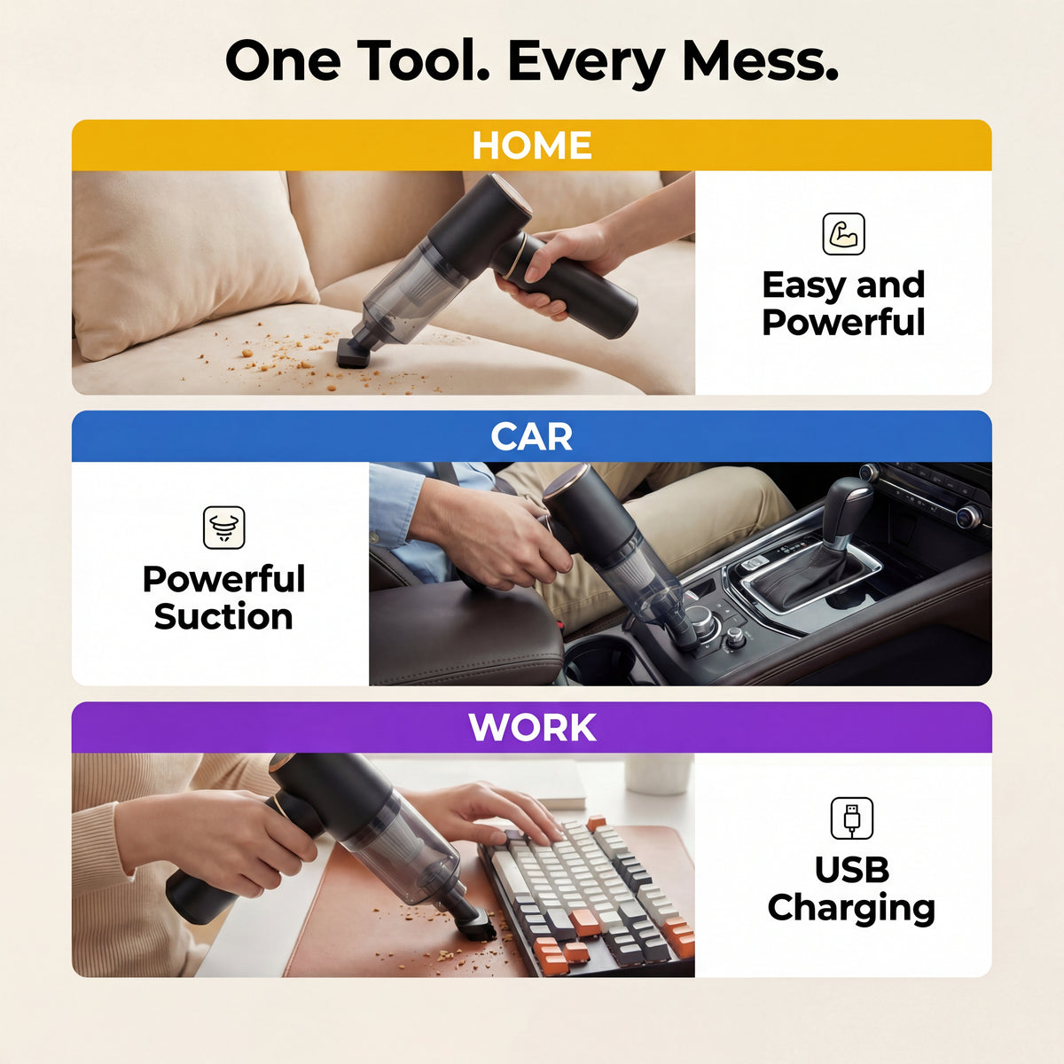Definitely. This device is engineered with specialized "Wet and Dry" functionality. This means it is safe and effective for cleaning up accidental liquid spills—like coffee, water, or soda—in addition to dry dust and crumbs. It is the perfect tool to handle life’s little messes on the go.